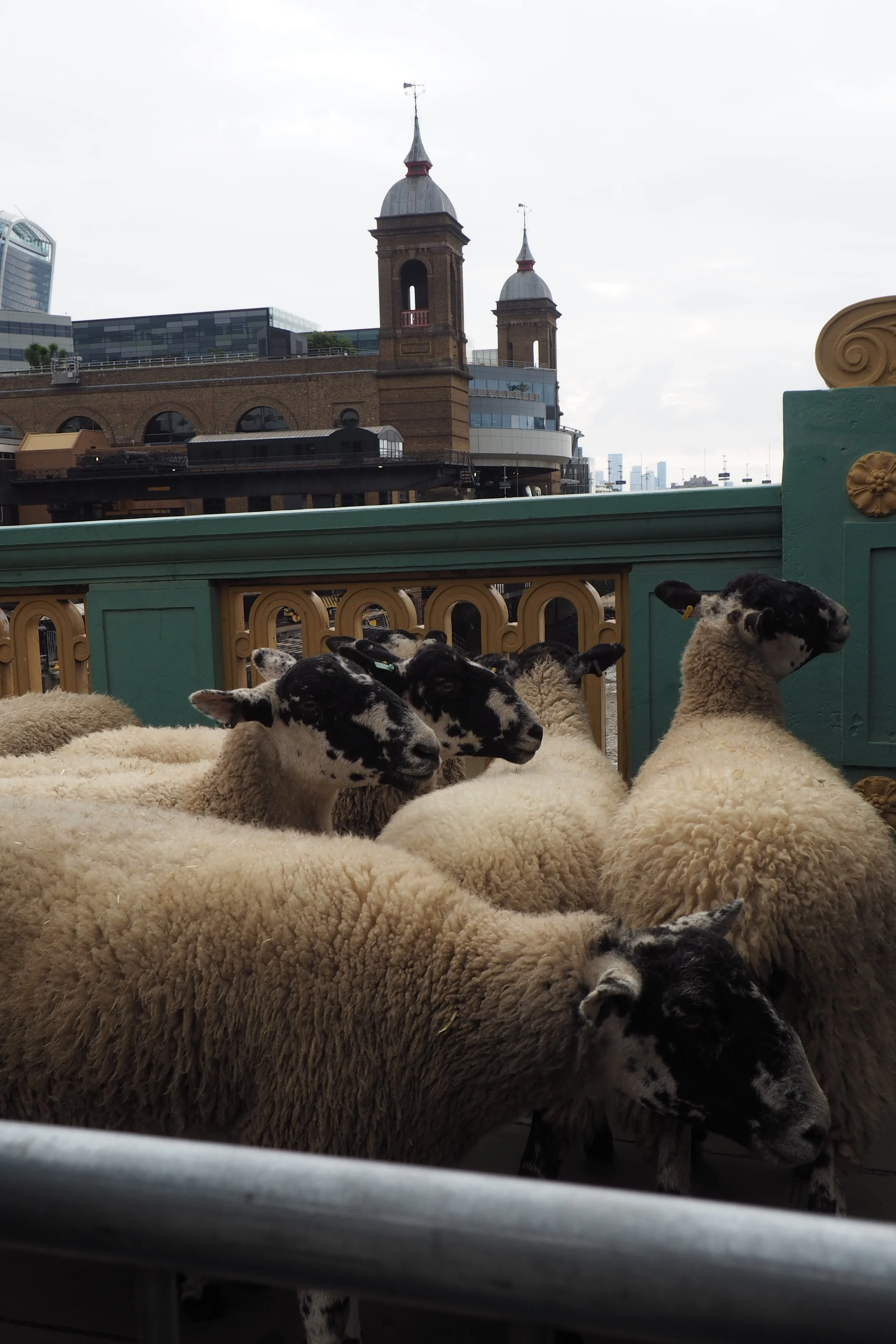 Un troupeau de moutons marchant dans une rue de la ville derrière des barricades métalliques, avec un homme en vert observant à proximité et des bâtiments modernes en arrière-plan.
